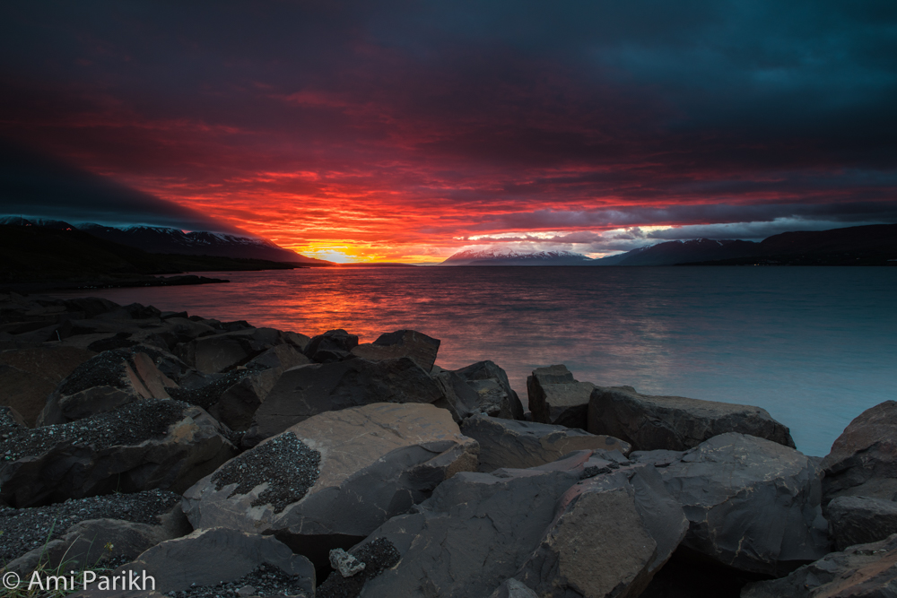 So it was with a pleasant surprise that the following incident occurred during our third night in Iceland. After driving along the Ring Road from the western part of Iceland, we reached our cottage in Akureyri, Iceland’s fourth largest city at approximately 11pm. Because of the long daylight hours, it is possible to sightsee in Iceland during spring / summer till pretty late. Exhausted, the kids ate quickly and checked into bed. The curtains were drawn in the bedrooms to simulate night time. Just out of curiosity, my husband and I peeped out of one of the curtains and were stunned to see a blood-red sky! We were witness to a spectacular midnight sunset.