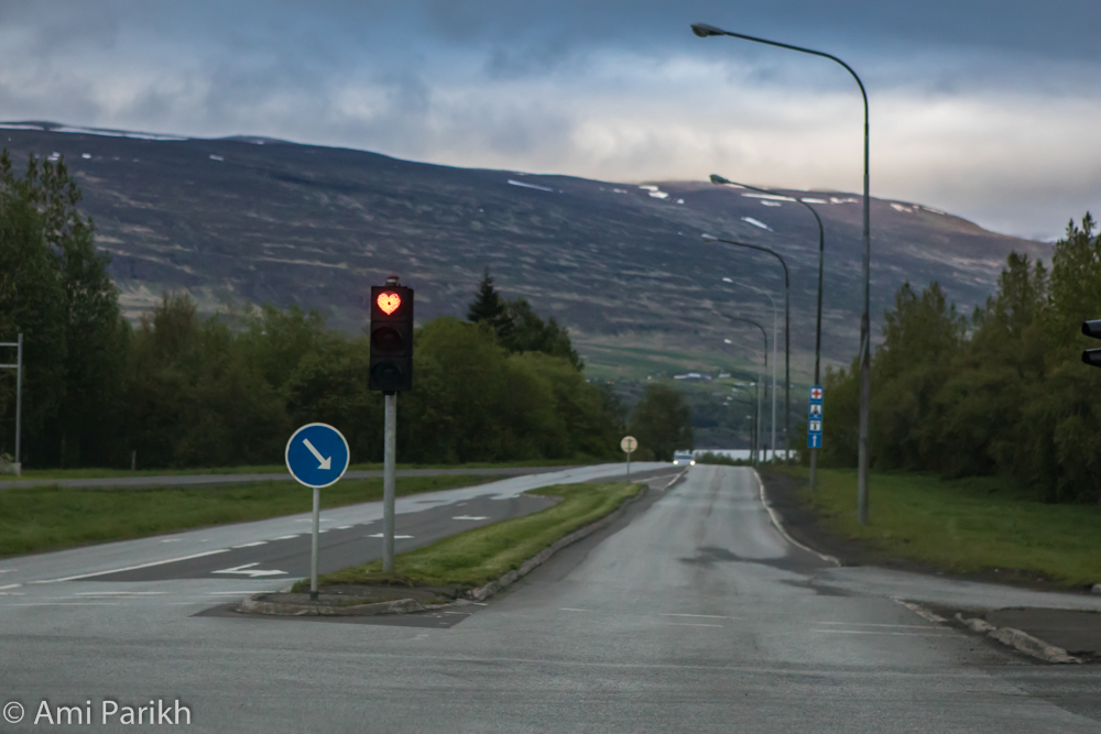 Top: Monochrome Image of Akureyri, Iceland’s fourth largest city ; Bottom: A Heart Shaped Red Light at a Traffic Signal in Akureyri