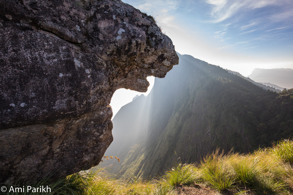 We spent a good amount of time on top of the tea estate clicking pictures and were about to head back, when we ran into a group of young folks, probably in their twenties, heading over with their guide/driver from the other side of the mountain. They urged us excitedly to head in the direction they had come from and to not miss seeing the tiger’s head before we left. So we told our guide that we wanted to see it too. He took us there but wasn’t too thrilled about this idea and we could soon see why. Viewing the “tiger’s head” , essentially a rock carved as the head of a tiger, involved dangerous navigation through narrow ledges and steep rocks and the actual tiger’s head, while gorgeous, was a straight fall down the mountain incase of any mishap.