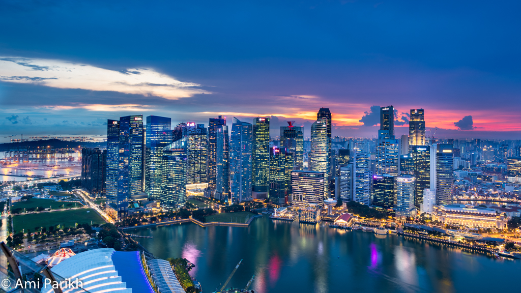 Sunset View of the Singapore Skyline from the Marina Bay Sands Hotel